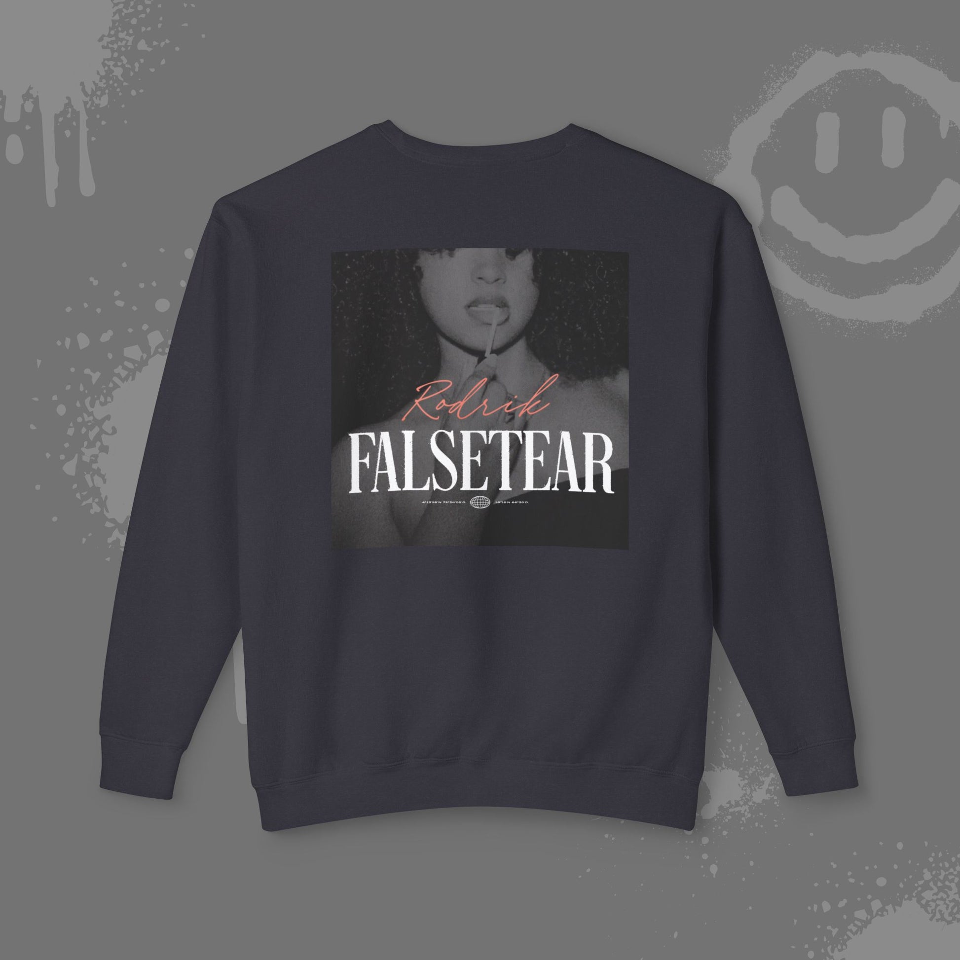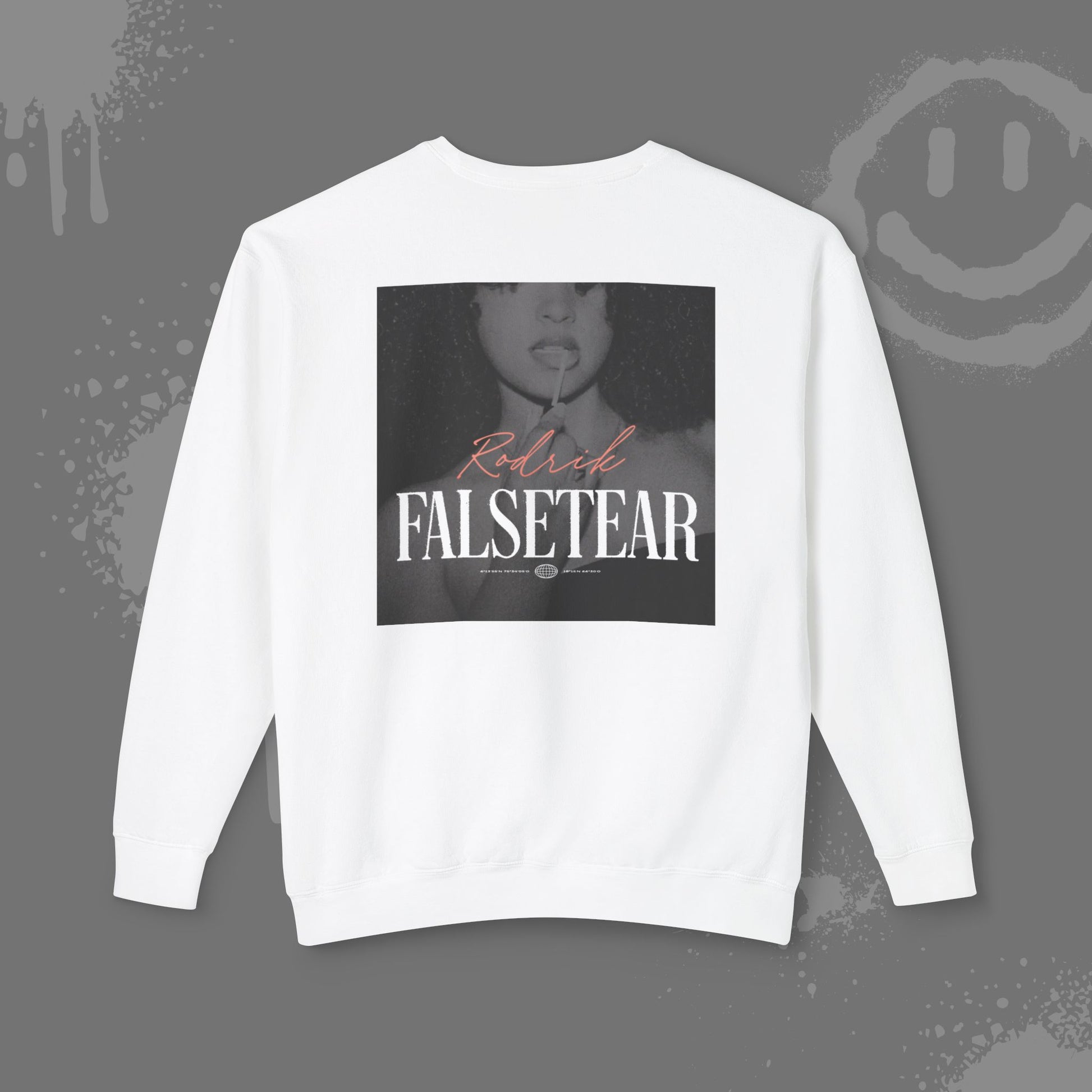 Sweater unisex blanco y negro con print ‘Falsetear’ al frente y logo Rodrik en la espalda.
